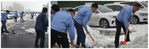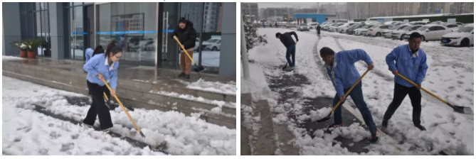 天亮了,上班路舉步維艱。大家?guī)缀跏腔械焦荆┖苊?,但是也會給我?guī)碡摀?。我們博訊廠區(qū)的廣場上鋪上了厚厚的積雪,給上班的同事們帶來了不便。行政人員第一時間組織人員進行鏟雪,雖然當時工具不齊全,但是輪番上陣也要融化這厚厚的雪。
